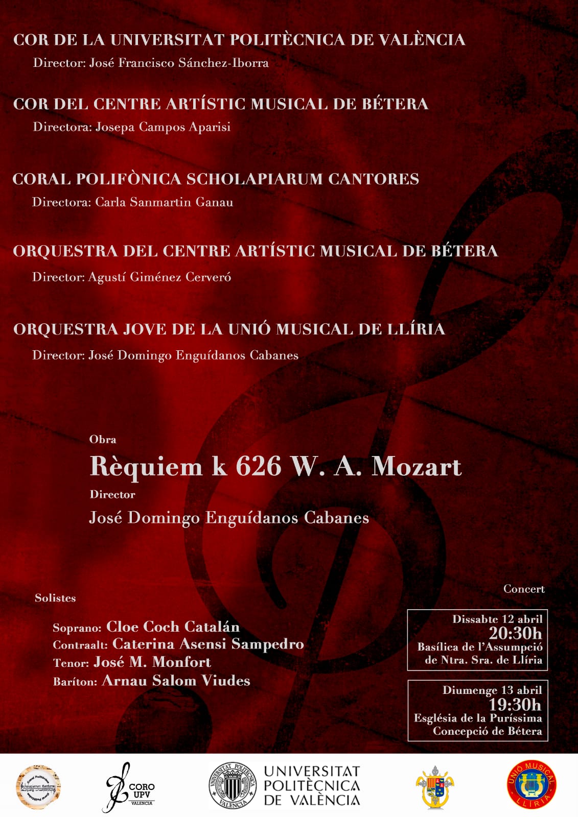 El Coro de la Universitat Politècnica de València tiene el honor de participar en la interpretación de una de las obras más conmovedoras y trascendentales del repertorio clásico: el Réquiem en re menor, K. 626 de Wolfgang Amadeus Mozart.